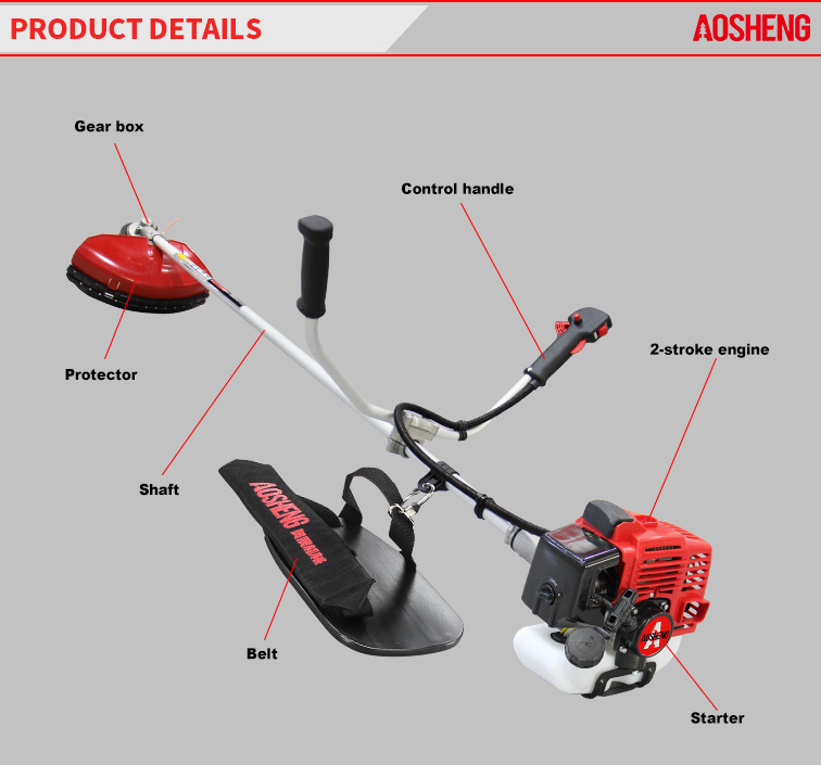 4-taktni motor visokih performansi, zapremina je 38CC. Profesionalna uporaba na otvorenom pustoši Veličina cijevi 26 mm * 1,5 mm, čvrstoća fleksibilne osovine. Širina rezanja je 420 mm Živ...