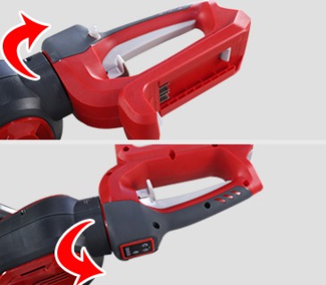 | 04Ručica prednje sklopkeTrimer živice može se pokrenuti samo ako su obje ručice prekidača (straga i prednje ručke) istovremeno depresivne. |